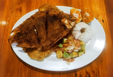 Mojarra frita: Crujiente y dorada, perfecta para disfrutar con patacones y ensalada.